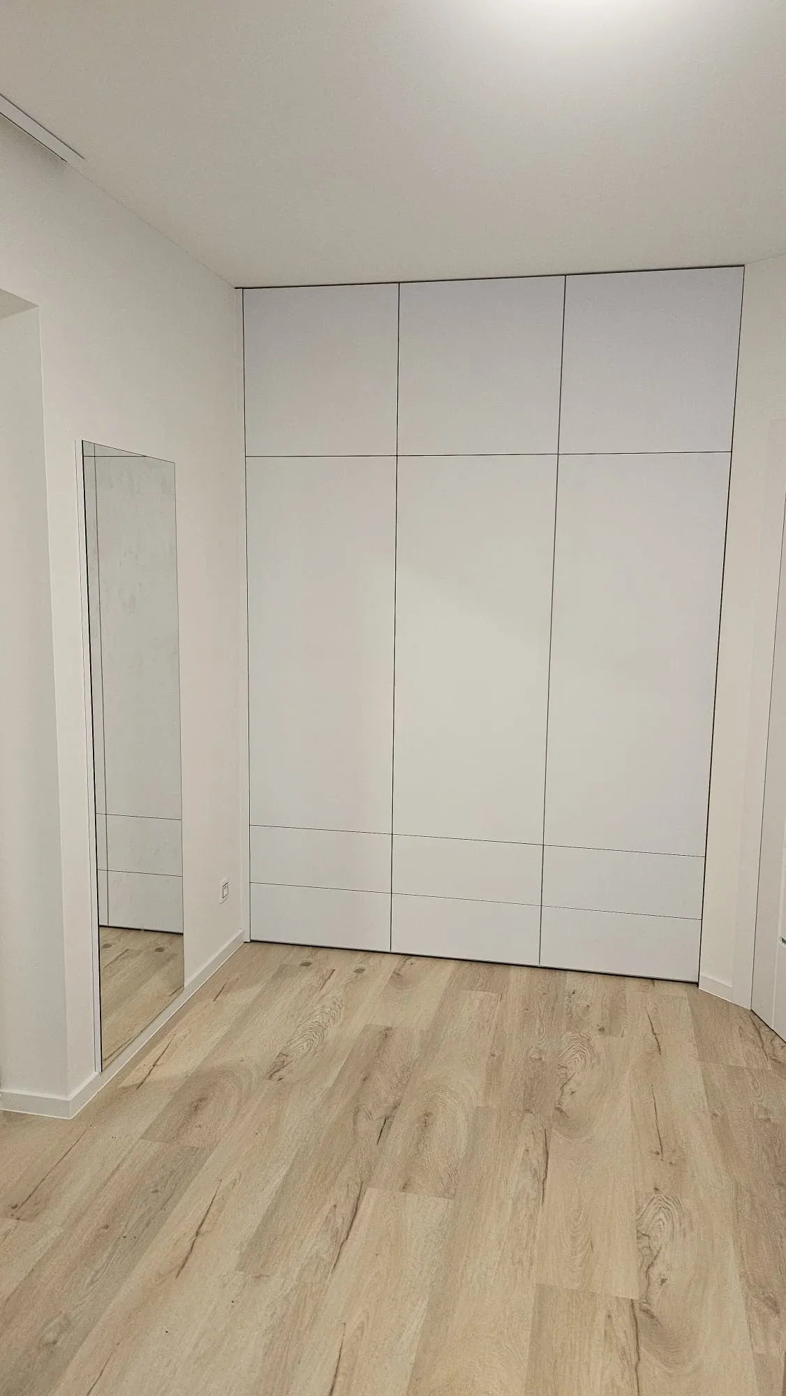 Návrh a realizace dětského pokoje laděné do světlé barvy v kombinaci s podlahou v dřevěném dekoru. V dětském pokoji se nachází atypicky řešená patrová postel, pracovní stůl a dostatek úložných prostor pro 2 děti.